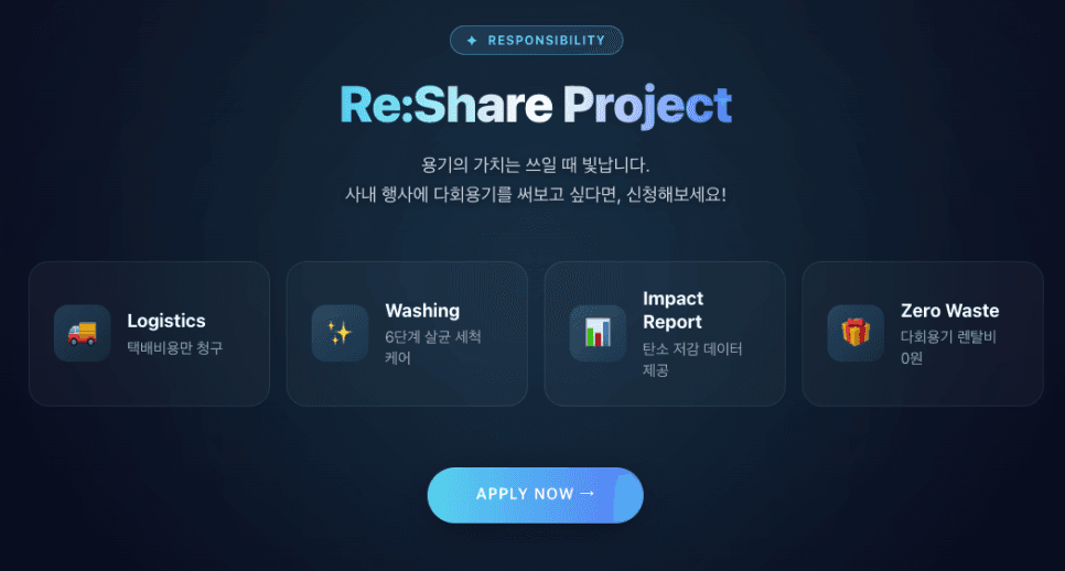 ๋ณดํต ์ฌ๋ด ํ์ฌ์ ๋คํ์ฉ ์ปต์ ๋ ํํ๋ ค๋ฉด ๊ฐ๋น ๋์ฌ๋ฃ, ๋ณด์ฆ๊ธ ๋ฑ ๋น์ฉ์ด ๋ง๋ง์น ์์ต๋๋ค. ํ์ง๋ง Re:Share ํ๋ก์ ํธ ๊ธฐ๊ฐ์๋ ๋คํ์ฉ๊ธฐ ๋ ํ๋น๊ฐ ์ ์ก ๋ฌด๋ฃ์ ๋๋ค.